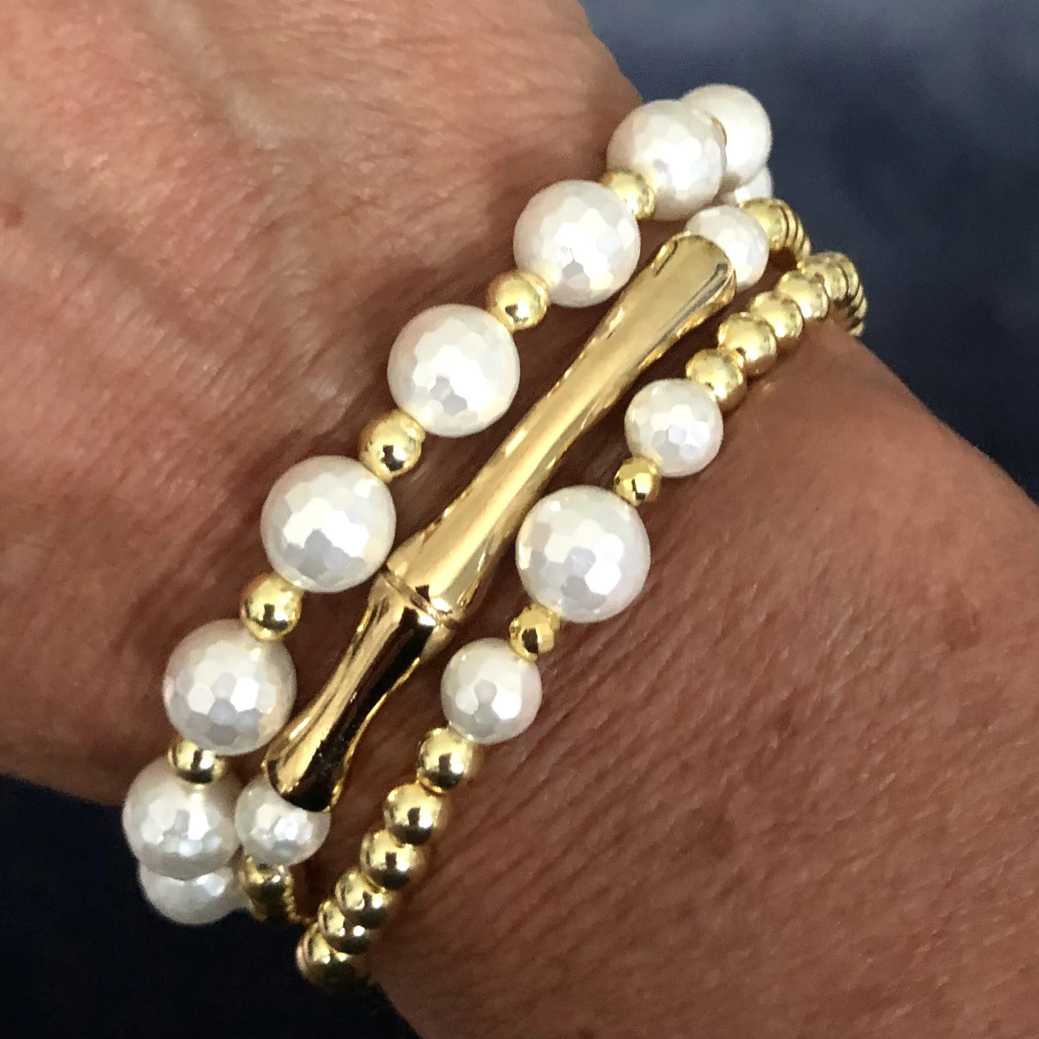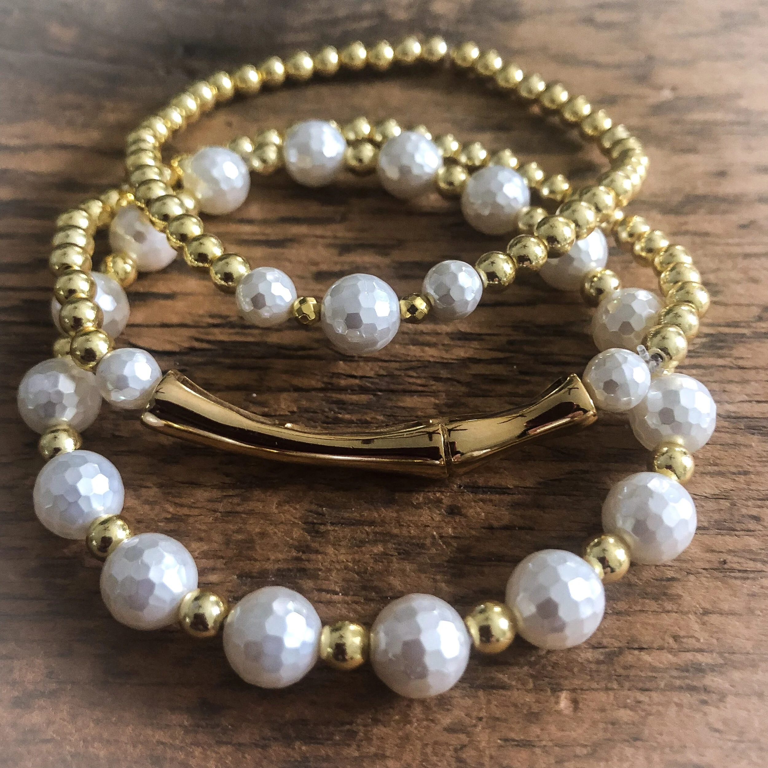 This is the signature design that started it all! The Trois' bracelet [3 STACK] offers timeless beauty in a comfortable, everyday style featuring beautiful Faceted Mother of Pearl and varying sizes of Semi-Precious Gold Hematite beads.