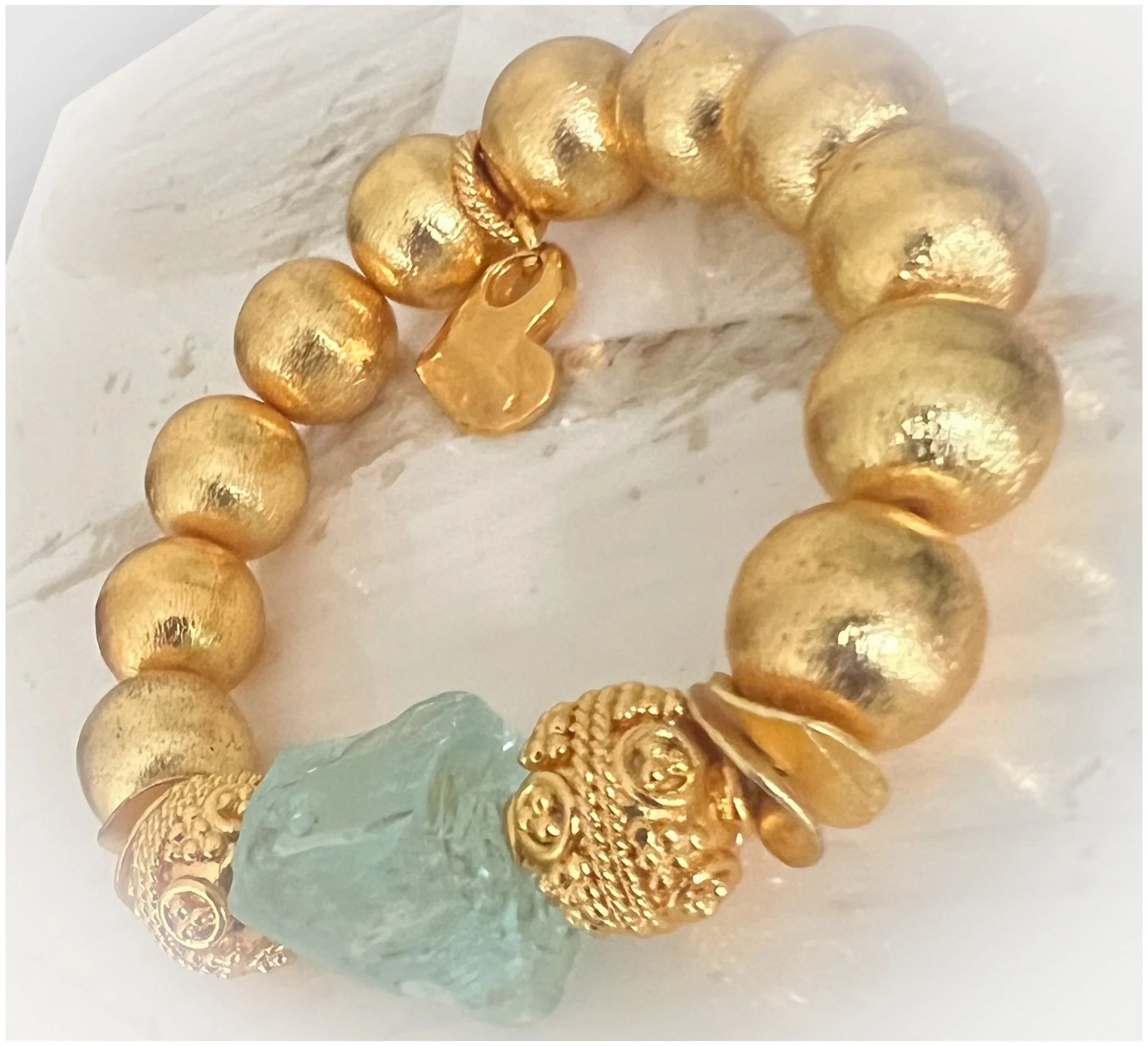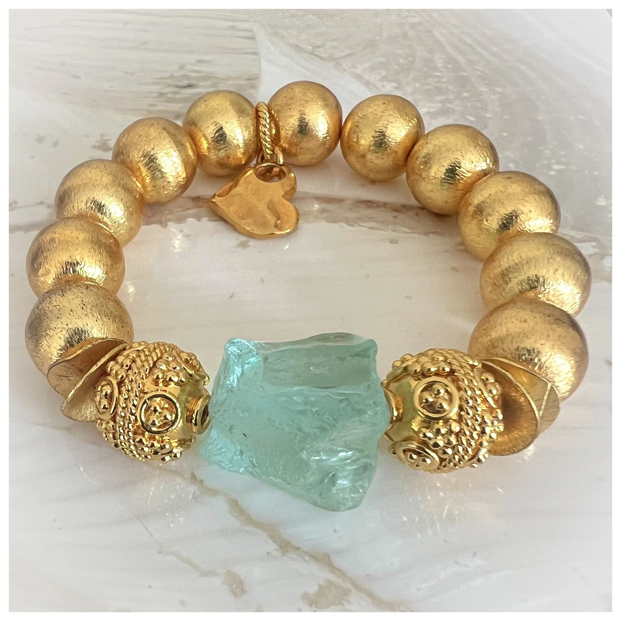 Infuse your style with the tranquil beauty of the shore! The Chatham bracelet showcases a gorgeous palette of soft coastal hues, featuring a distinctive two-sided nautilus shell focal. This centerpiece is artfully surrounded by carved ivory and creamy mother-of-pearl beads, all elevated by elegant gold accents finished a brushed gold heart
