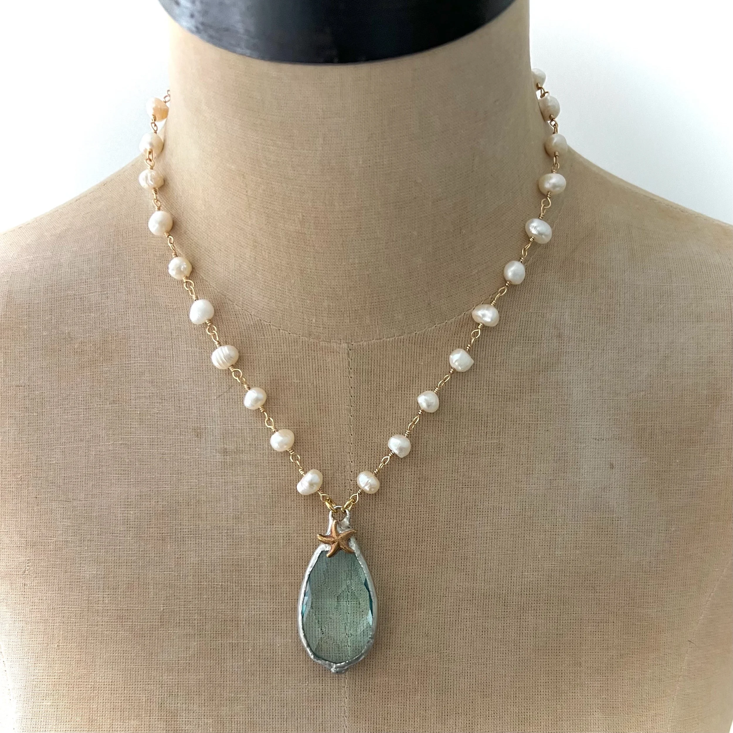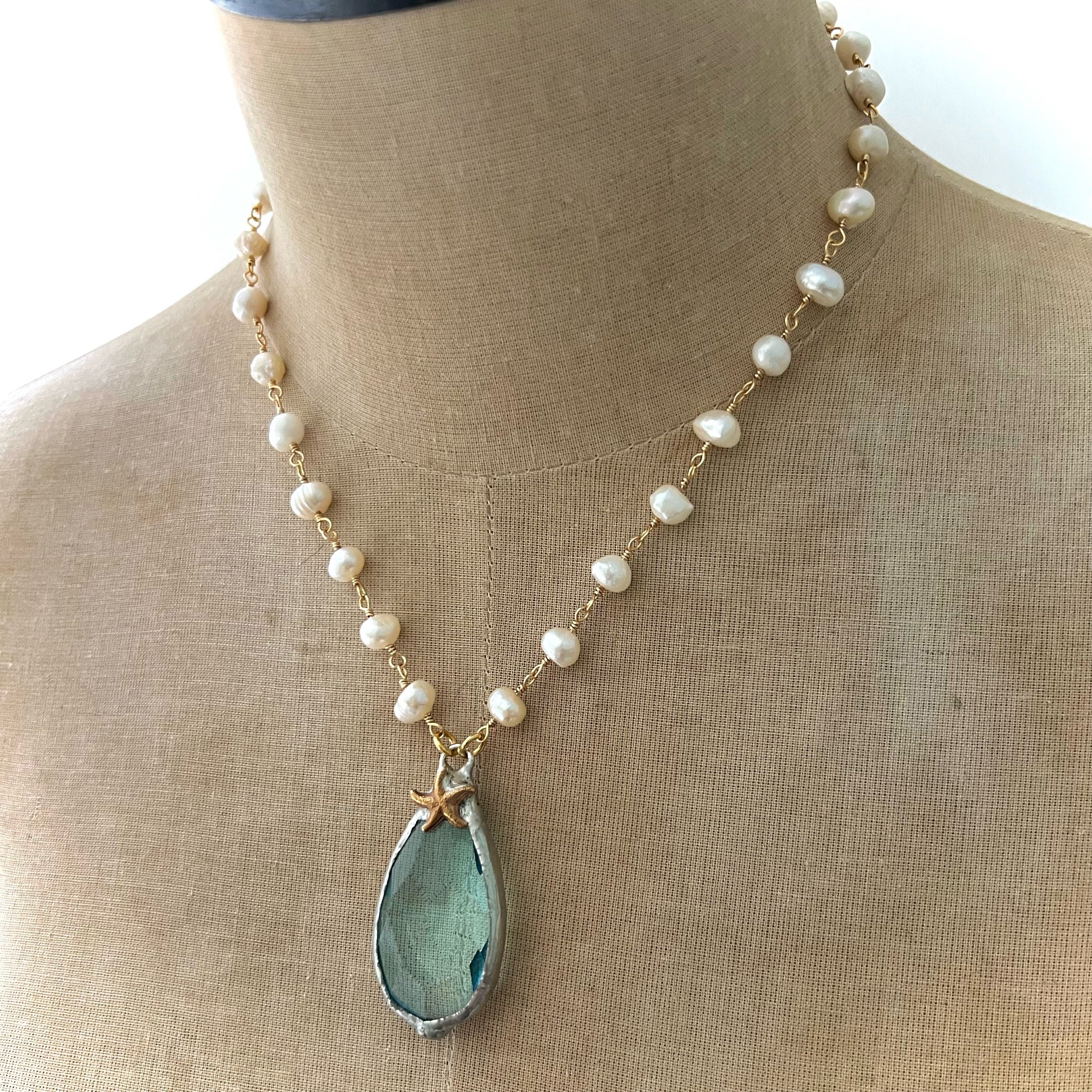 LIMITED EDITION! This stunning pendant is a true find, handcrafted by a gifted woman artist. The centerpiece is a radiant 1.5" faceted aqua crystal, perfectly complemented by a golden starfish. It's suspended from an 18" gold Freshwater pearl chain, adding an extra touch of beauty. Magnetic clasp closure