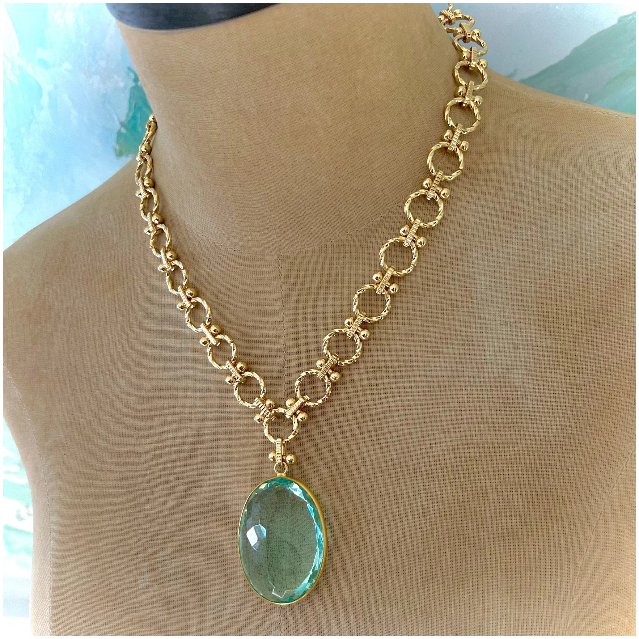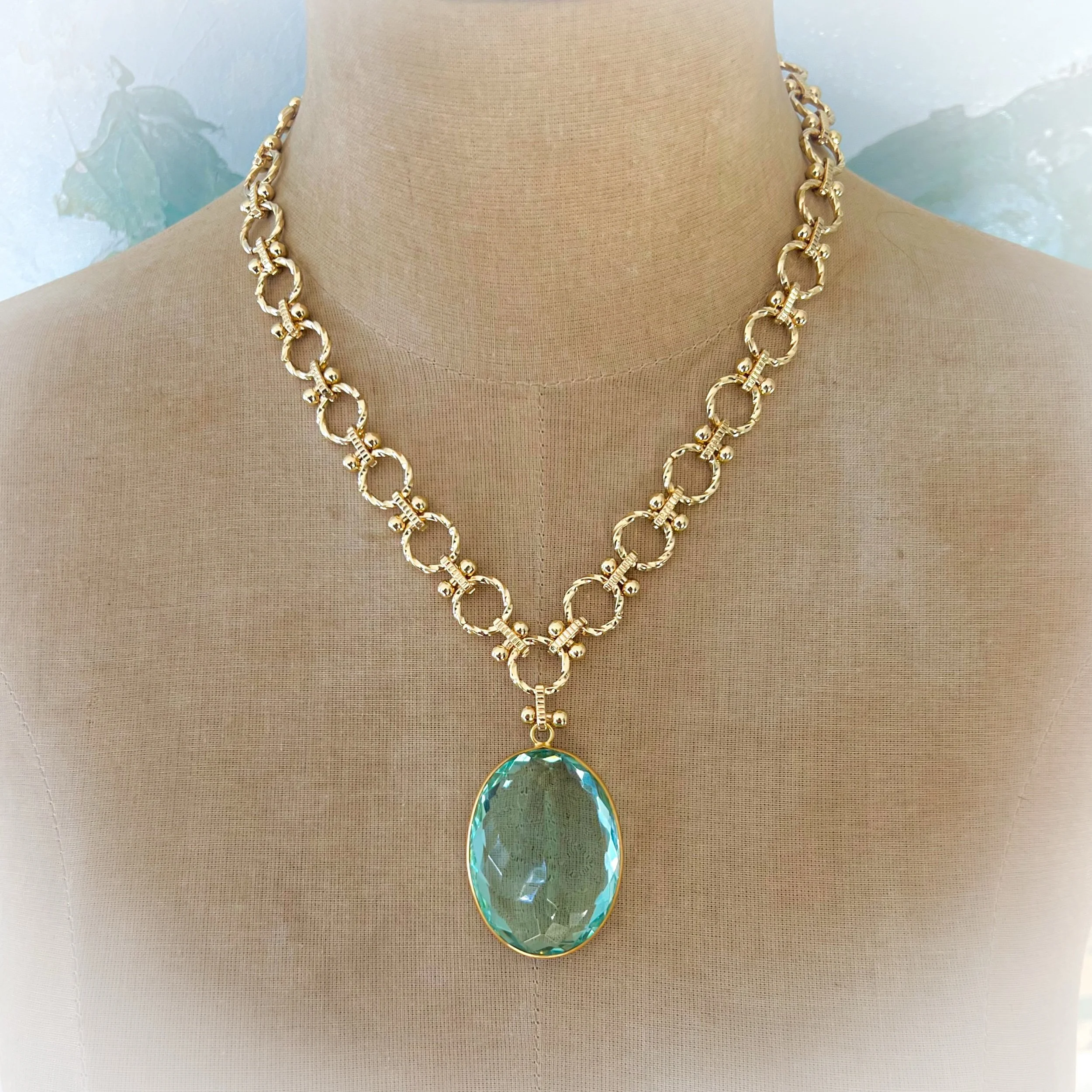 A dramatic three white shell focal point with hints of pink is surrounded by gold brushed shell accents and 14mm polished rose quartz beads. Finished with a gold shell charm.