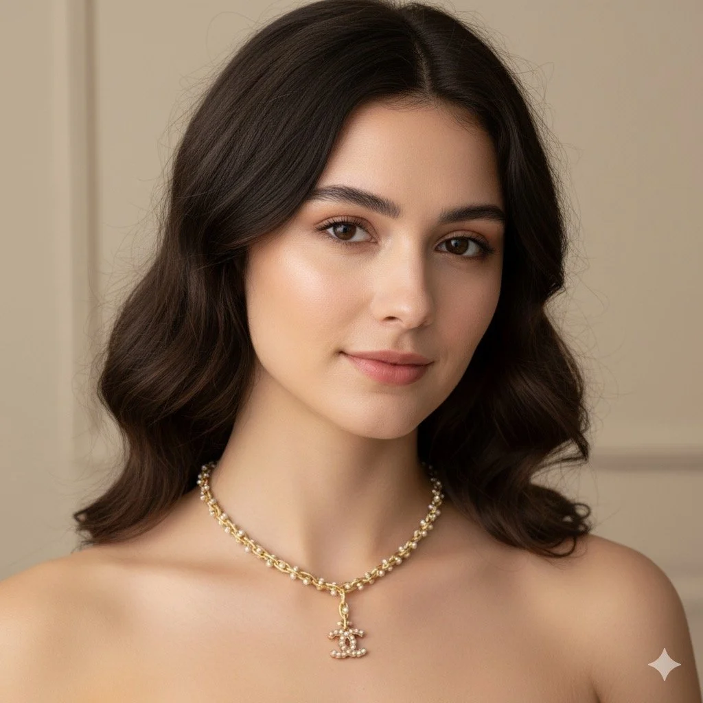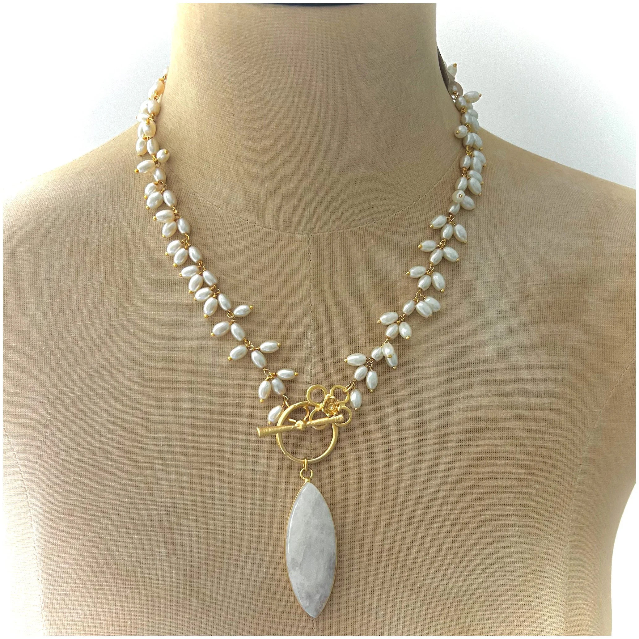 The 3-inch moonstone is accented with a border of brushed 24kt gold. It rests on an 18-inch chain adorned with dangle pearls, finished with a stylish ornate gold toggle closure.