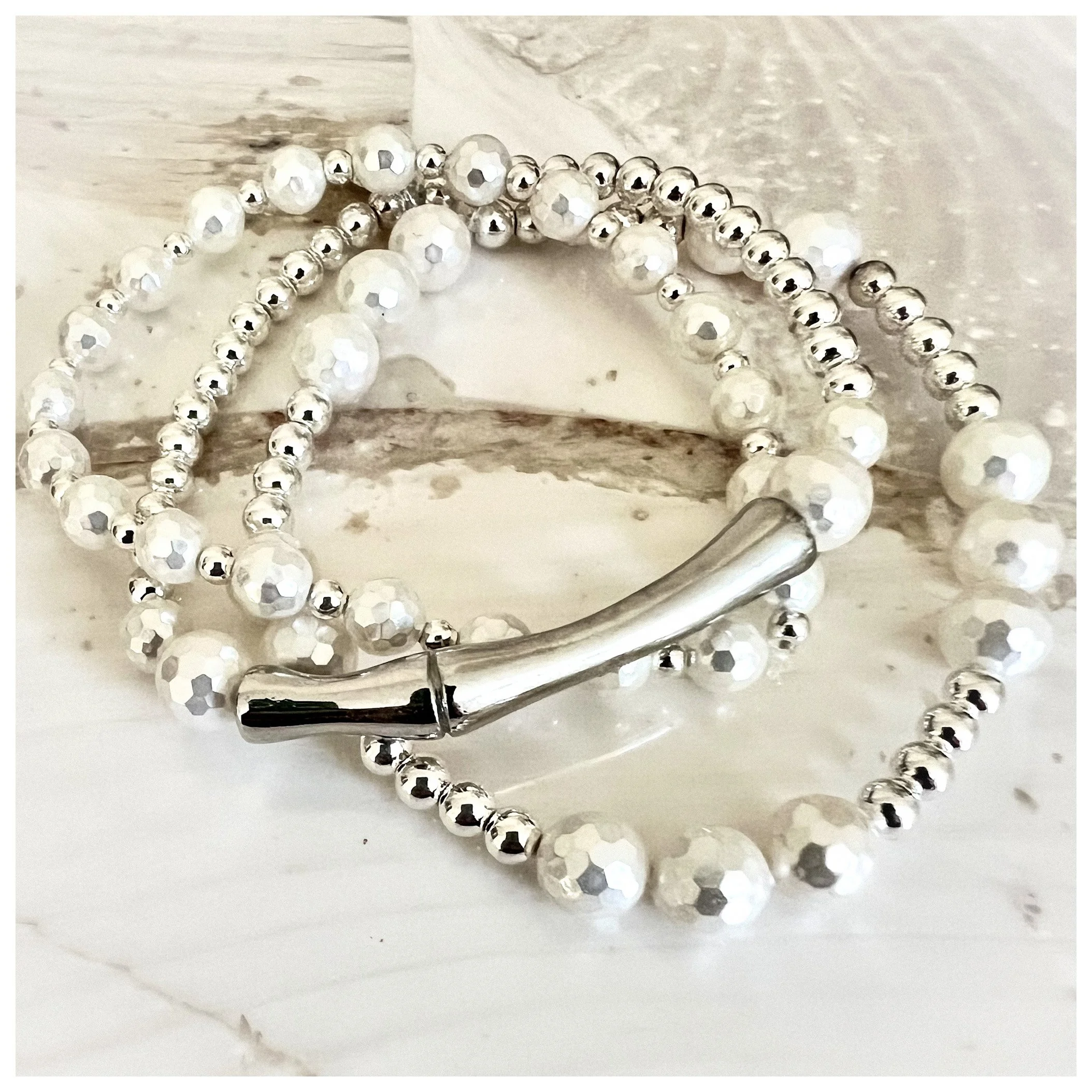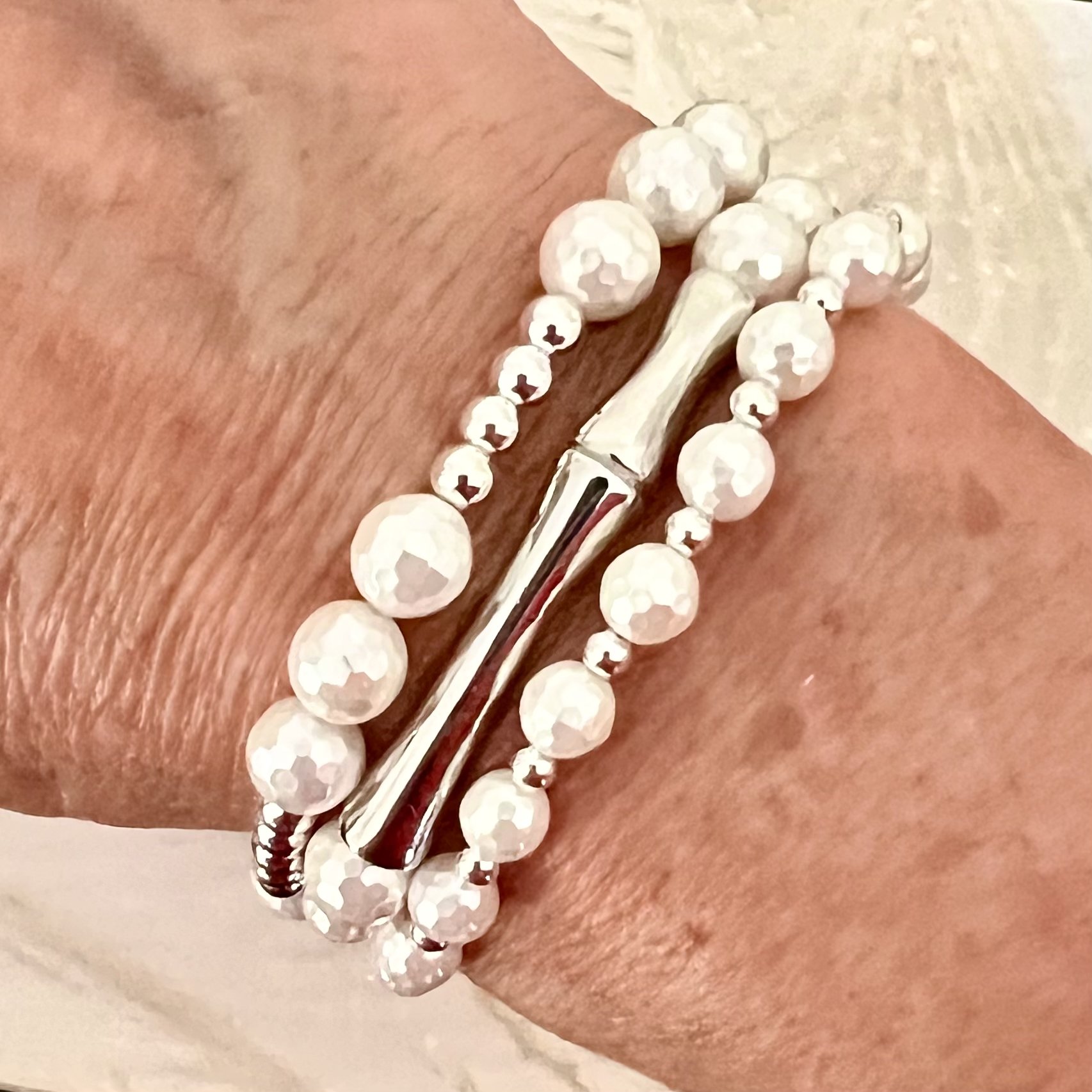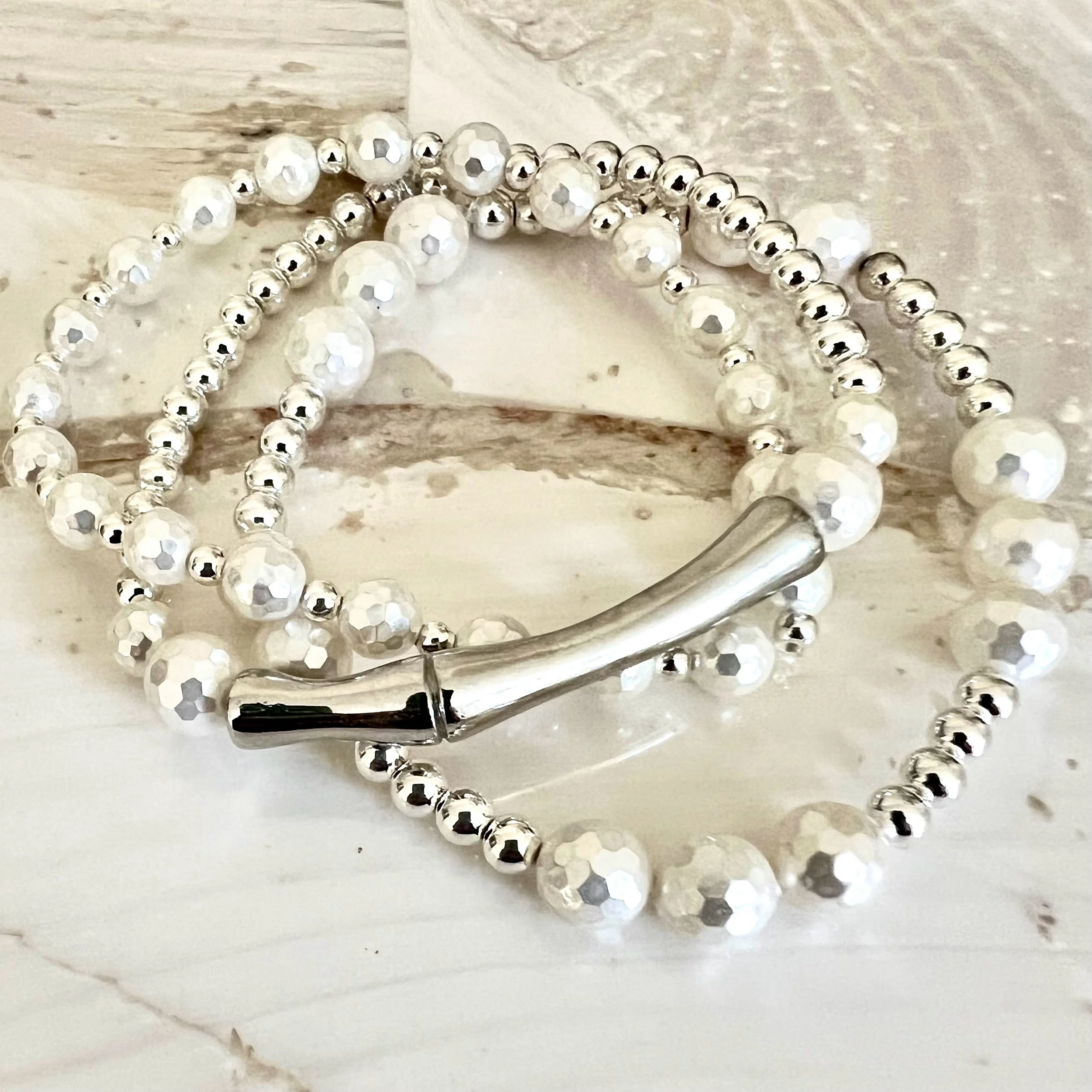 This is the signature design that started it all and continues to be a top seller. The Trois' bracelet [3 STACK] offers timeless beauty in a comfortable, everyday style featuring beautiful Faceted Mother of Pearl and varying sizes of Semi-Precious Silver Hematite beads.