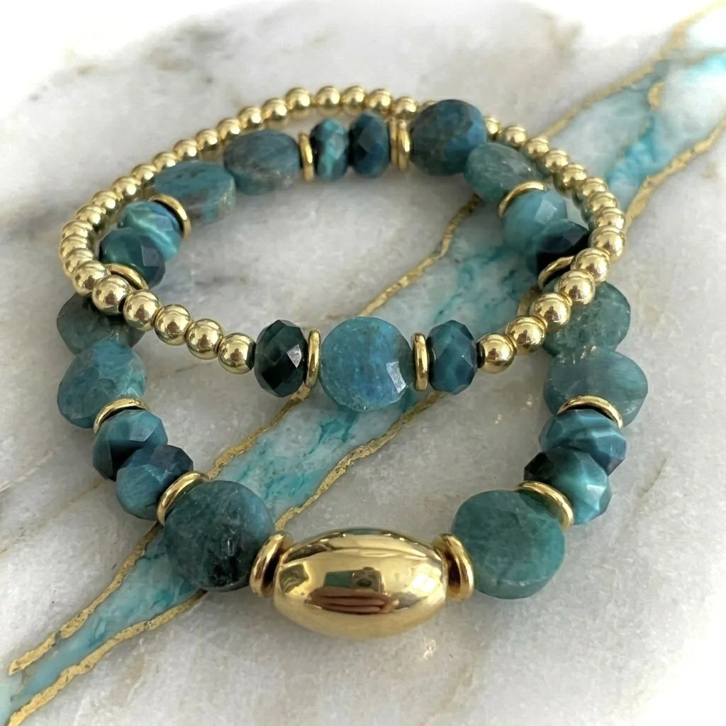 MOTAVATION ✨ DYNAMIC ✨ASSURANCE That’s The Beautiful Semi Precious APATITE Stone! A Variation Of Round, Coin, & Rondelle Beads Surrounding By Non Tarnishing Gold Beads In This Amazing [2 STACK] Stretch Bracelets Fit Most 7- 7-1/2” Wrists. Made With L💙VE In Massachusetts!
