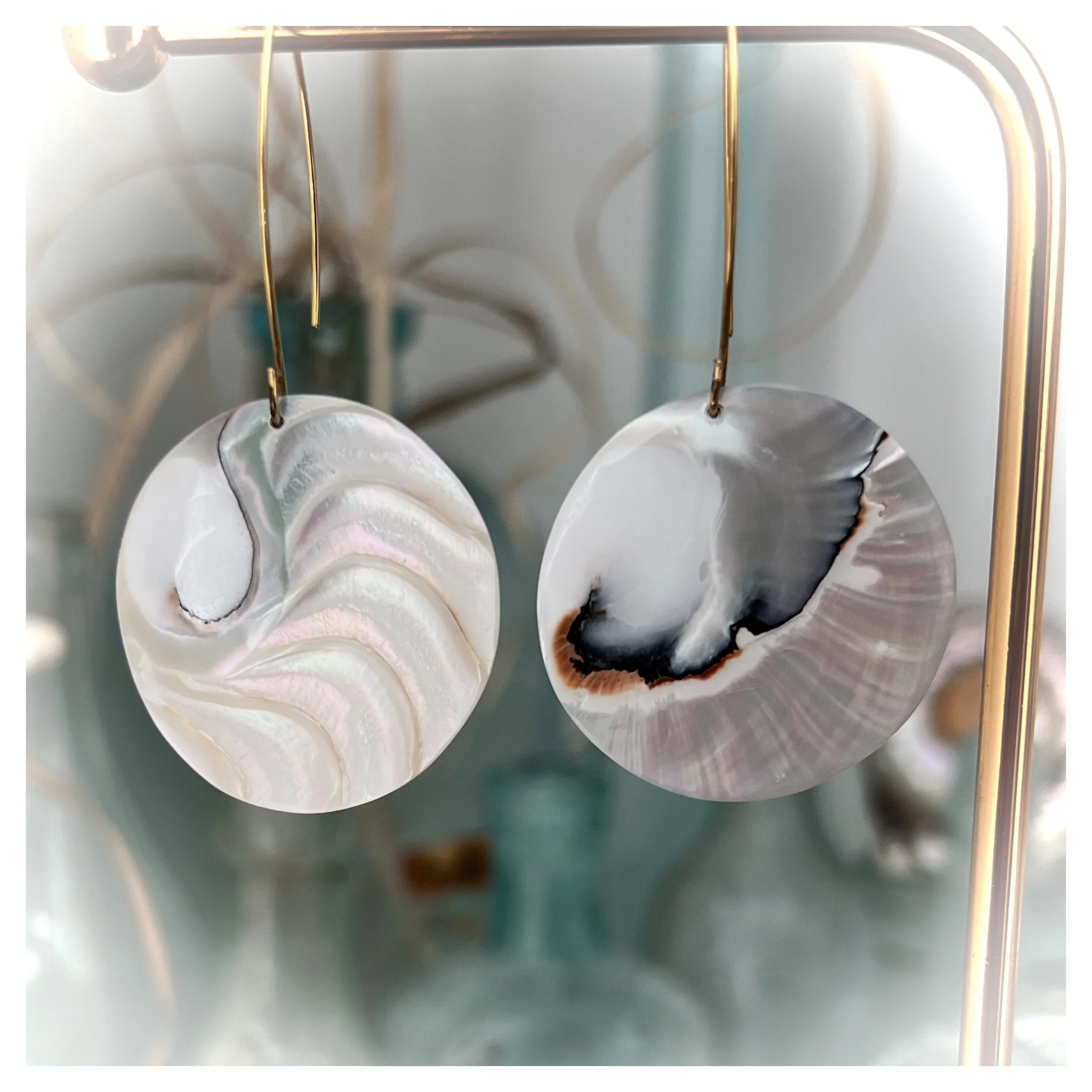 Dual-Sided Design Features "beach" grooved textures for a natural, organic feel. With other revealing a stunning "Tiger’s Eye" pattern in iridescent sea blue and crisp white. 1.5” round discs with a total 2” drop. Finished on gold thin ear wires. Designed with L💙VE in Massachusetts.