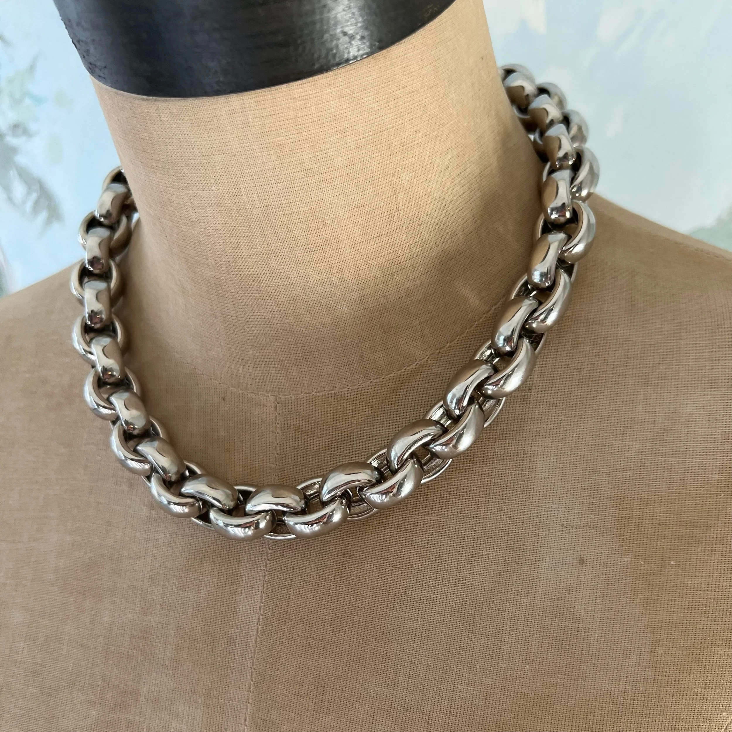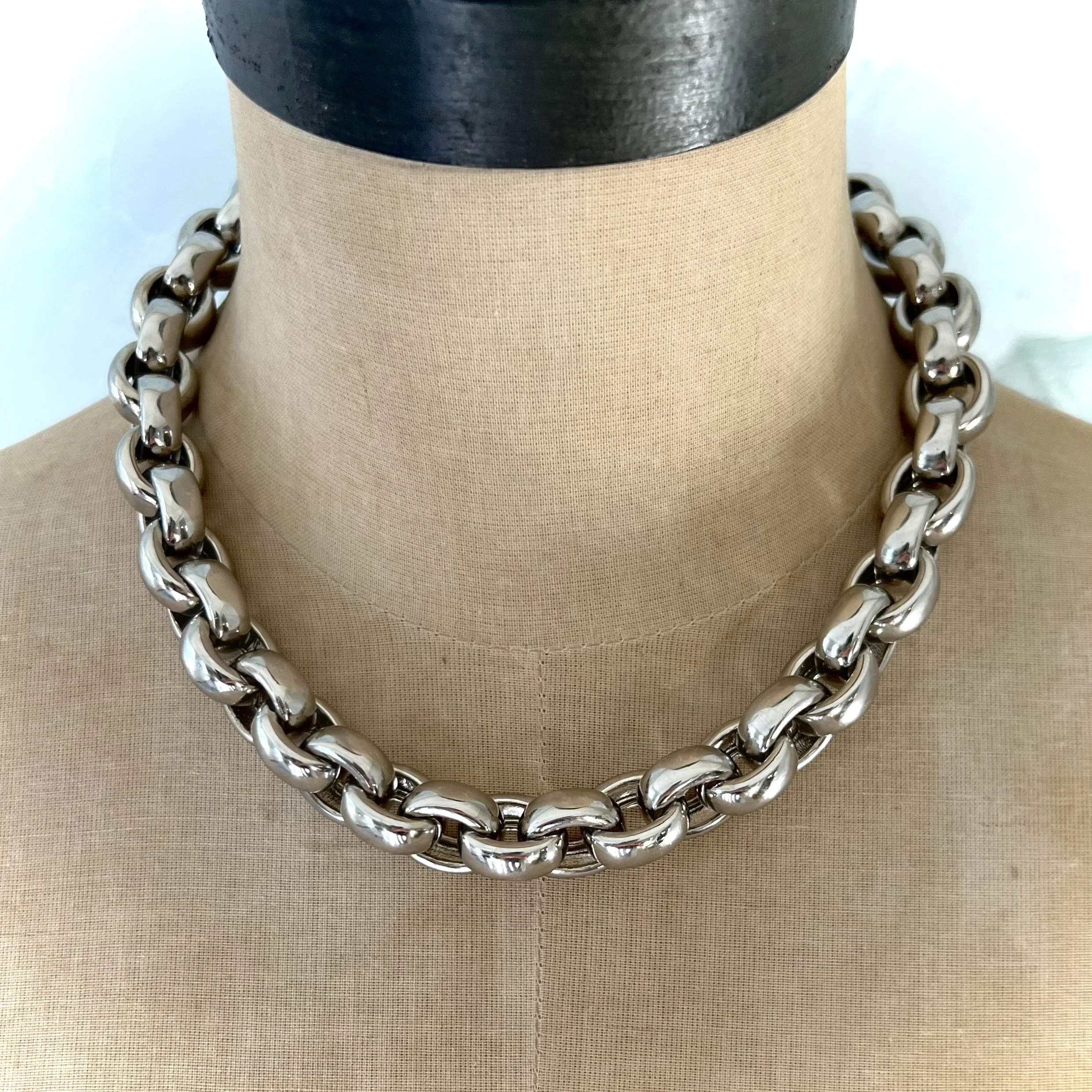 The piece is crafted from substantial, high-polished links, creating a chunky, collar-style choker look. The rounded, barrel-like shape of the individual links gives the piece a tactile, sculptural quality. Finished in a brilliant, mirror-like platinum tone, this necklace offers the luxurious appearance of fine metal. The clasp is artfully designed within a link.