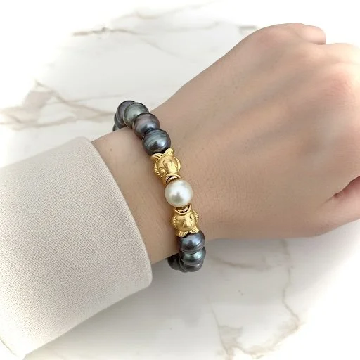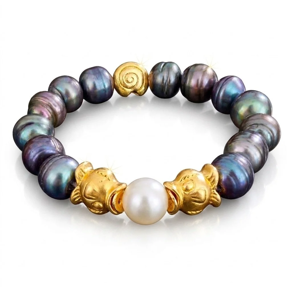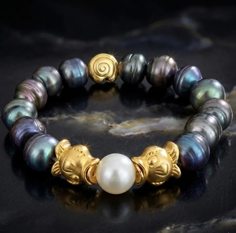 Discover a truly unique piece with our Coastal 2Di4 CLASSIC bracelet. This stretch bracelet features a charming golden koi fish "kissing" a white freshwater pearl. The design is beautifully framed by high-luster, magical black pearls, all complemented by a golden shell Designed to fit most 7-7.5 inch wrists, each bracelet is crafted with love in Massachusetts.